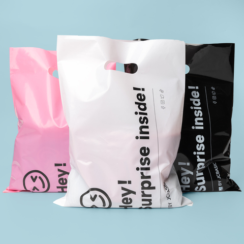 Enveloppes personnalisées en plastique réutilisables Sacs d'expédition de cadeaux en vrac avec poignées Sacs à provisions en plastique découpés à l'emporte-pièce